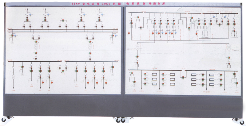“ 35kV變電站及10kV供配電系統(tǒng)倒閘操作屏”是針對變電站倒閘操作而專門研制的實訓(xùn)裝置。本系統(tǒng)含35kV、10kV和0.4kV三個電壓等級:35kV具有4路進(jìn)線,雙母帶聯(lián)絡(luò);10kV側(cè)采用單母分段,兩入兩出,環(huán)網(wǎng)供電;0.4kV側(cè)采用單母分段,并具有備用發(fā)電系統(tǒng)。在此典型35kV變電站模型上,學(xué)生可以進(jìn)行各種工況下的倒閘操作。變電站的電壓等級和結(jié)線方式也可以根據(jù)用戶要求設(shè)計。因此本裝置適合各類職業(yè)院校供配電類、電力公司、職業(yè)技能培訓(xùn)部門等機(jī)構(gòu)的培訓(xùn)、考核。