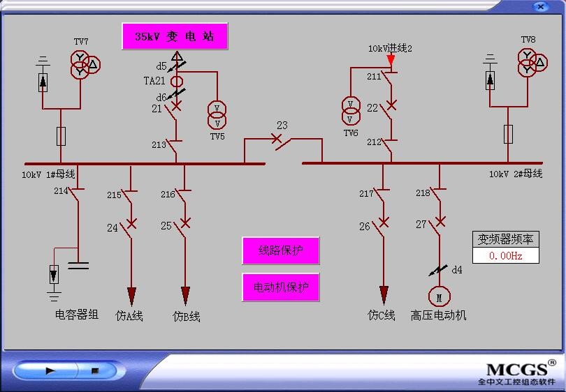 8.  SCADA軟件,軟件配置無限時(shí)加密狗,監(jiān)控軟件與RTU裝置、智能電量監(jiān)測(cè)儀、微機(jī)保護(hù)裝置、通信網(wǎng)絡(luò)構(gòu)成供配電SCADA系統(tǒng),實(shí)現(xiàn)供配電系統(tǒng)遙信、遙控、遙測(cè)功能。監(jiān)控界面截圖如下示。
