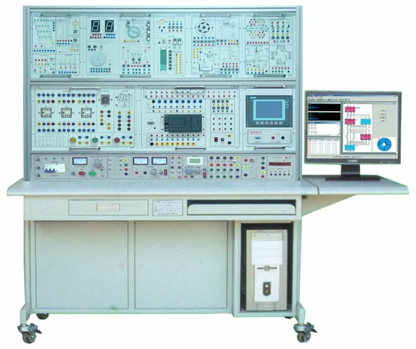 實訓裝置由控制屏、實訓桌、PLC主機實訓組件、實訓模擬對象掛箱(含豐富的工業(yè)現(xiàn)場設(shè)備模擬實訓對象)、變頻器掛箱、觸摸屏掛箱、交流電機、接觸器、按鈕、行程開關(guān)、工控組態(tài)軟件、仿真軟件、電機等組成。