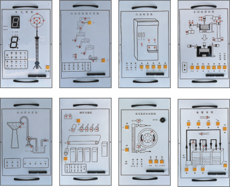 演示裝置上對PLC的輸入輸出均采用24V電源,5V電源供執(zhí)行機(jī)構(gòu)中的外圍使用,每套演示裝置主要由十七塊實驗掛箱組成,它們的型號分別為: