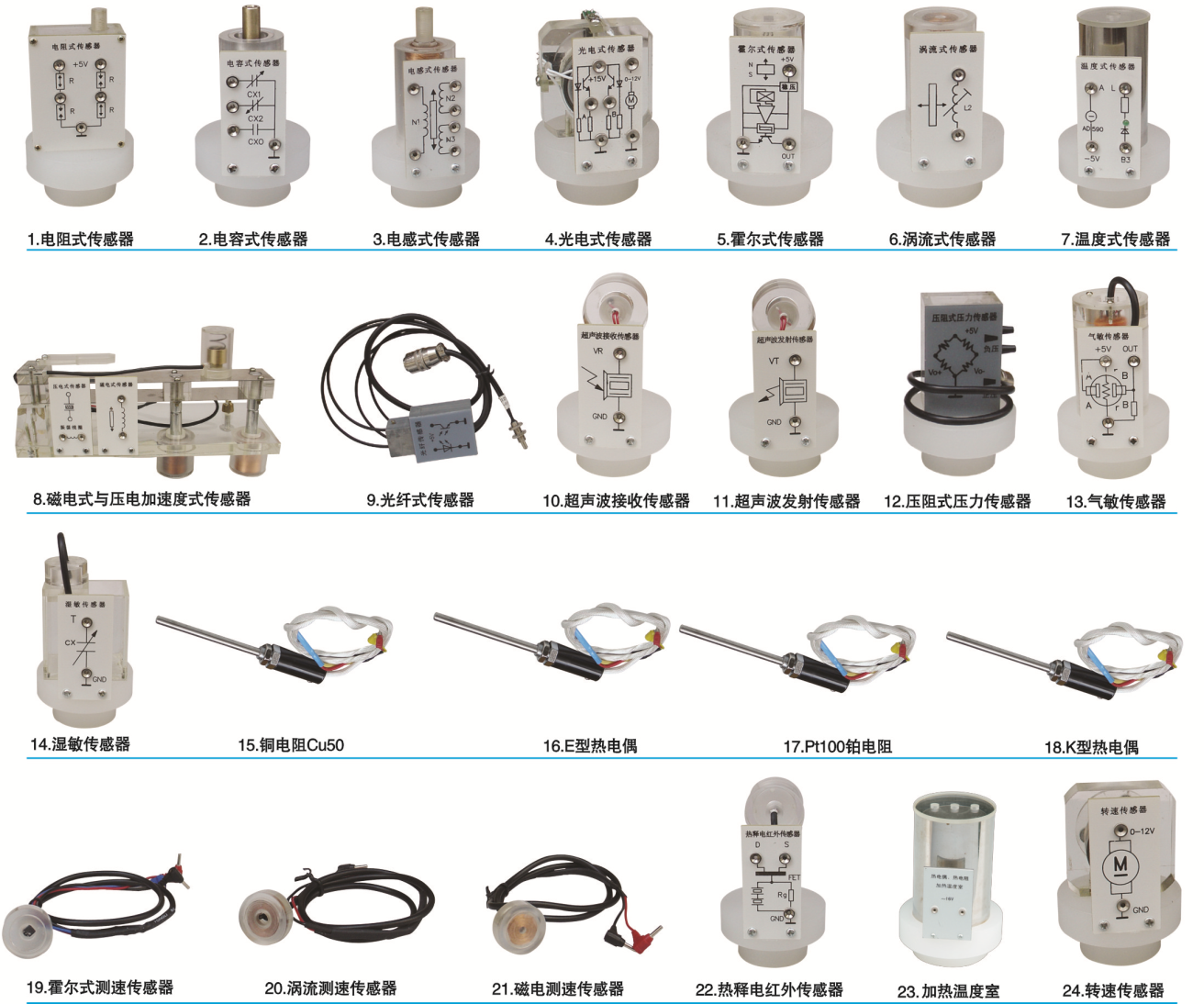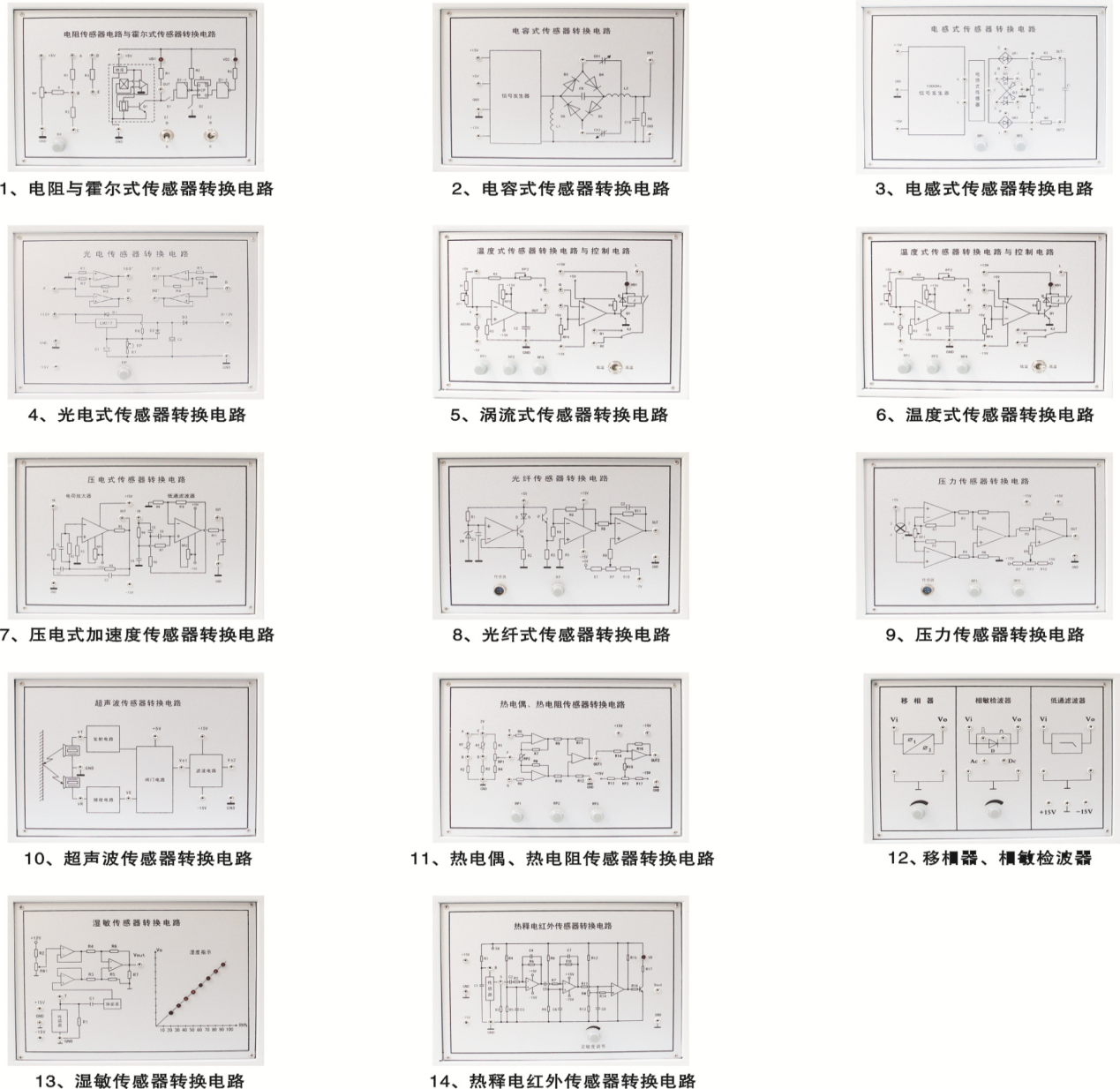 2、每種傳感器每個獨立,傳感器上印有原理圖與接線口,給學生做實驗時快捷方便,而且老師可以帶到課堂上講課用。