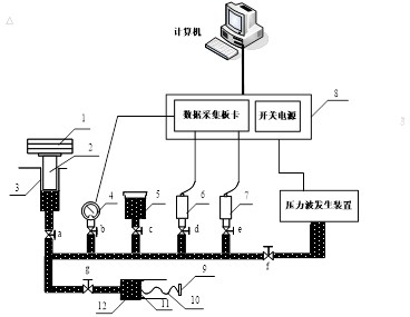 實(shí)驗(yàn)裝置主要由穩(wěn)態(tài)壓力波發(fā)生裝置、工業(yè)用遠(yuǎn)傳壓力表、低響應(yīng)頻率的壓力傳感器、高頻壓力傳感器、開關(guān)電源、數(shù)據(jù)采集板卡、計(jì)算機(jī)以及管路組成,系統(tǒng)結(jié)構(gòu)簡(jiǎn)圖如圖1所示。