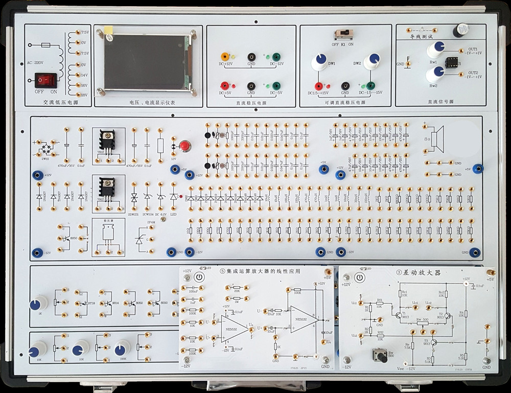 固定線路獨立模塊是實驗箱的又一重要組成部分。這些模塊采用了獨特的設計,如電源輸入設計在模塊的4角上,采用錯位設計方式避免插反或插錯,以及使用觸摸開關(guān)控制模塊電路上的電源等。模塊的種類豐富,包括晶體管共射放大器、場效應管放大電路、差分放大電路、負反饋放大電路等,可以滿足各種實驗需求。