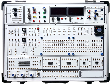 含機箱、工作電源、常用模擬信號源、實驗電路區(qū)和分立元件