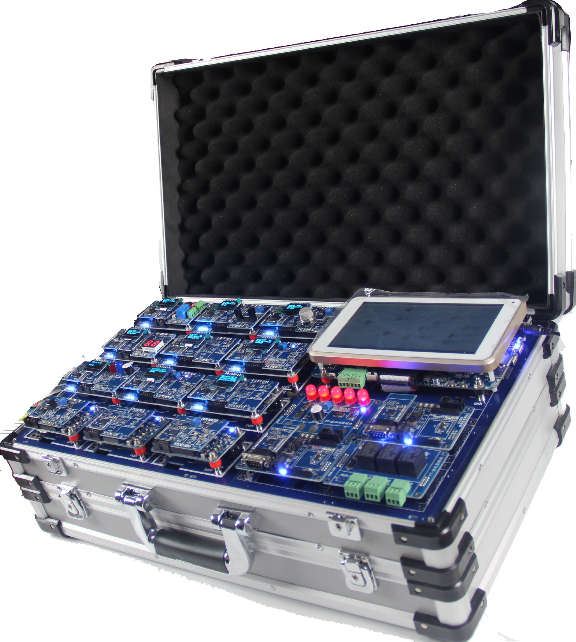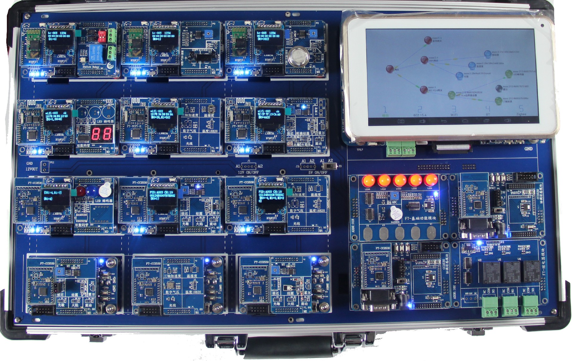 無線傳感網(wǎng)全功能實驗箱,是集成Bluetooth、WiFi、IEEE802.15.4、ZigBee等短距離無線通信技術(shù),將6LowPAN(IPv6)互聯(lián)網(wǎng)協(xié)議應(yīng)用到短距離無線通信網(wǎng)絡(luò)中,與ZigBee使用的ZStack協(xié)議棧并存,支持雙協(xié)議棧;集成LoRa、NB-IoT等長距離無線通信技術(shù),自定義傳感網(wǎng)協(xié)議,CoAP應(yīng)用協(xié)議,實現(xiàn)主從機組網(wǎng)應(yīng)用,平臺接入應(yīng)用。采用三星Cortex-A9 S5P4418四核處理器作為智能網(wǎng)關(guān),支持6LowPAN、Z-Stack、自定義傳感網(wǎng)協(xié)議等多協(xié)議解析,具有1GB內(nèi)存、8GB大容量存儲空間、7寸電容觸摸顯示屏、豐富的外圍接口,可板載GPS定位、WIFI/BT二合一通訊、4G移動通訊等多種模塊,內(nèi)嵌Android、Linux雙系統(tǒng),可一鍵切換。