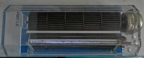 內(nèi)機(jī)為一體化成型透明有機(jī)玻璃外殼,可清晰的看到內(nèi)機(jī)結(jié)構(gòu),包括風(fēng)筒、電機(jī)、蒸發(fā)蒸發(fā)器。