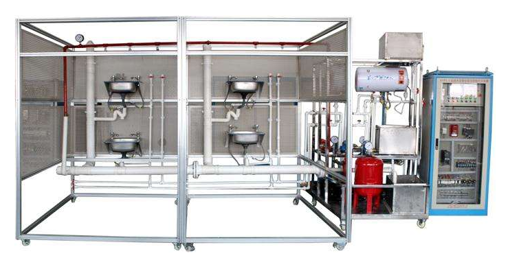 1.不銹鋼水盤(pán),冷、熱兩用水龍頭,模擬兩層建筑、網(wǎng)孔式房間、4個(gè)住戶(hù)用水終端