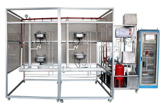 2.消防給水系統(tǒng):主要有給水箱、噴淋泵、穩(wěn)壓罐、濕式報警閥、壓力開關(guān)、水流指示器、消防給水管道、閉式噴淋頭等組成。管路采用鍍鋅管進行設(shè)計,可進行鍍鋅管的切割、套絲、安裝和通水試驗操作,通過控制系統(tǒng)可實現(xiàn)噴淋滅火功能。