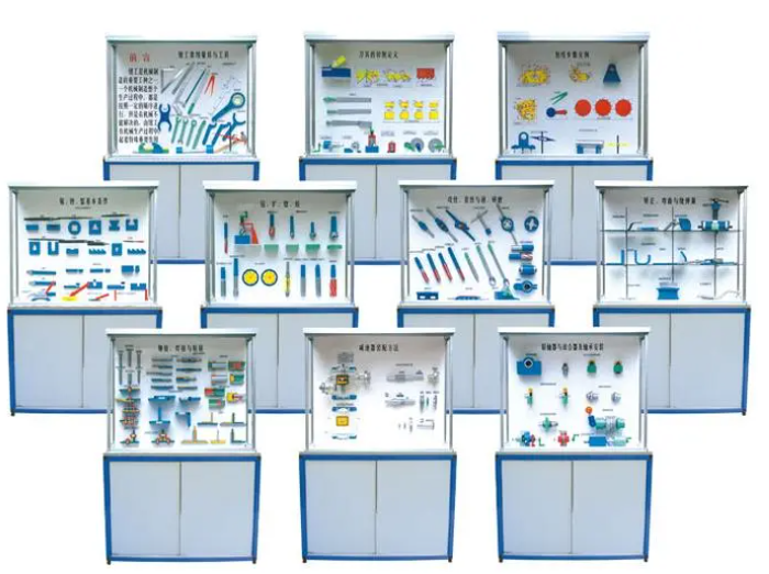 這套陳列柜共分為十個柜和一臺DVD控制臺,設(shè)計巧妙,功能齊全。每個陳列柜的尺寸均為1250×430×1780mm,便于擺放和移動。陳列柜內(nèi)擺放著各種模具教學(xué)模型,這些模型均按照教材要求制作,旨在幫助學(xué)生更好地理解模具設(shè)計原理和成型工藝。