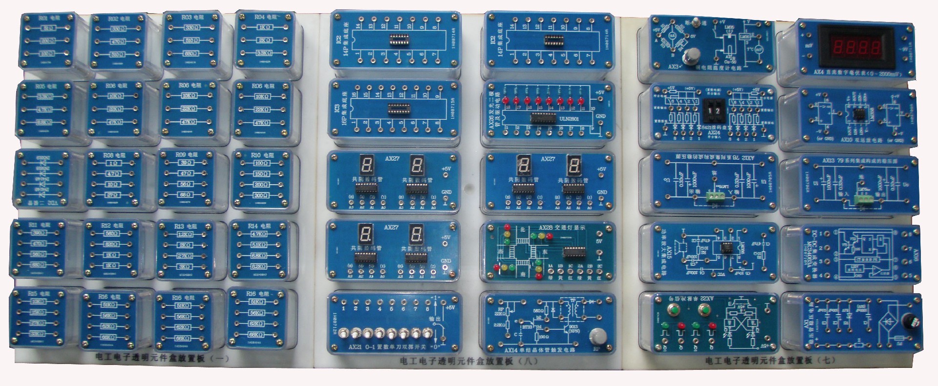 實訓模塊由透明元件盒及PCB板構成,元件盒是組合式透明元件盒,元件盒單元組采用多元件、典型實訓單元電路、典型傳感器、通用集成電路插座等制成,可根據(jù)實訓需要方便地組合成不同的電工電子實訓線路;使實訓具有開放性和創(chuàng)新性,元件盒體由透明有機工程塑料注塑而成,具有示教功能,使使用者能夠觀察到元件形狀和接線方式,有利于教師講解和學生認識;面板采用PCB制作而成,表面清爽、符號線路清晰、表面耐磨損、元件更換容易;面板上標志的元件電路符號采用最新國家標準,具有整體結構緊湊、外形美觀大方、安裝簡單、使用保管方便等特點。導線插孔采用防轉座,導線裝有彈性插頭可在模塊上面插接,以保證可靠連接進行各種實訓;實訓時可根據(jù)實訓內(nèi)容和技能訓練的需要,方便的任意組合實訓線路,以完成不同的實訓項目等。