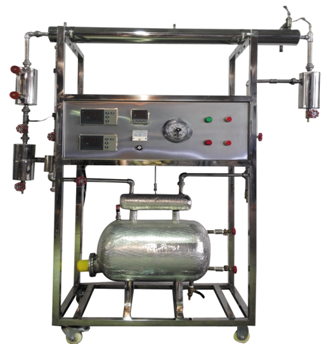 電蒸汽鍋爐、套管換熱器、蒸汽冷凝罐、蒸汽及水流量測試設(shè)備、加熱由固體調(diào)壓模塊無級調(diào)節(jié),由多路巡檢儀顯示的溫度測試系統(tǒng),不銹鋼臺架及控制屏等。