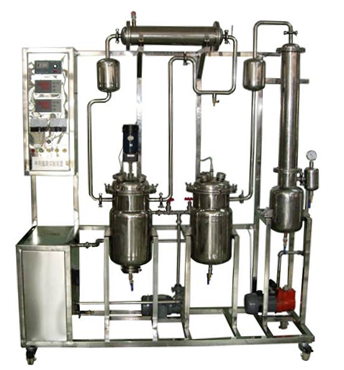 本裝置由提取罐、蒸發(fā)器、攪拌電機(jī)、列管式加熱器、冷凝器、油分器、收油器、藥液泵、貯液罐、過(guò)濾器、真空泵、調(diào)速器、數(shù)顯溫度儀、不銹鋼框架、控制屏等組成。提取罐、蒸發(fā)器配導(dǎo)熱油加熱系統(tǒng),提取罐、蒸發(fā)器頂部蒸汽出口均設(shè)置了除沫器。